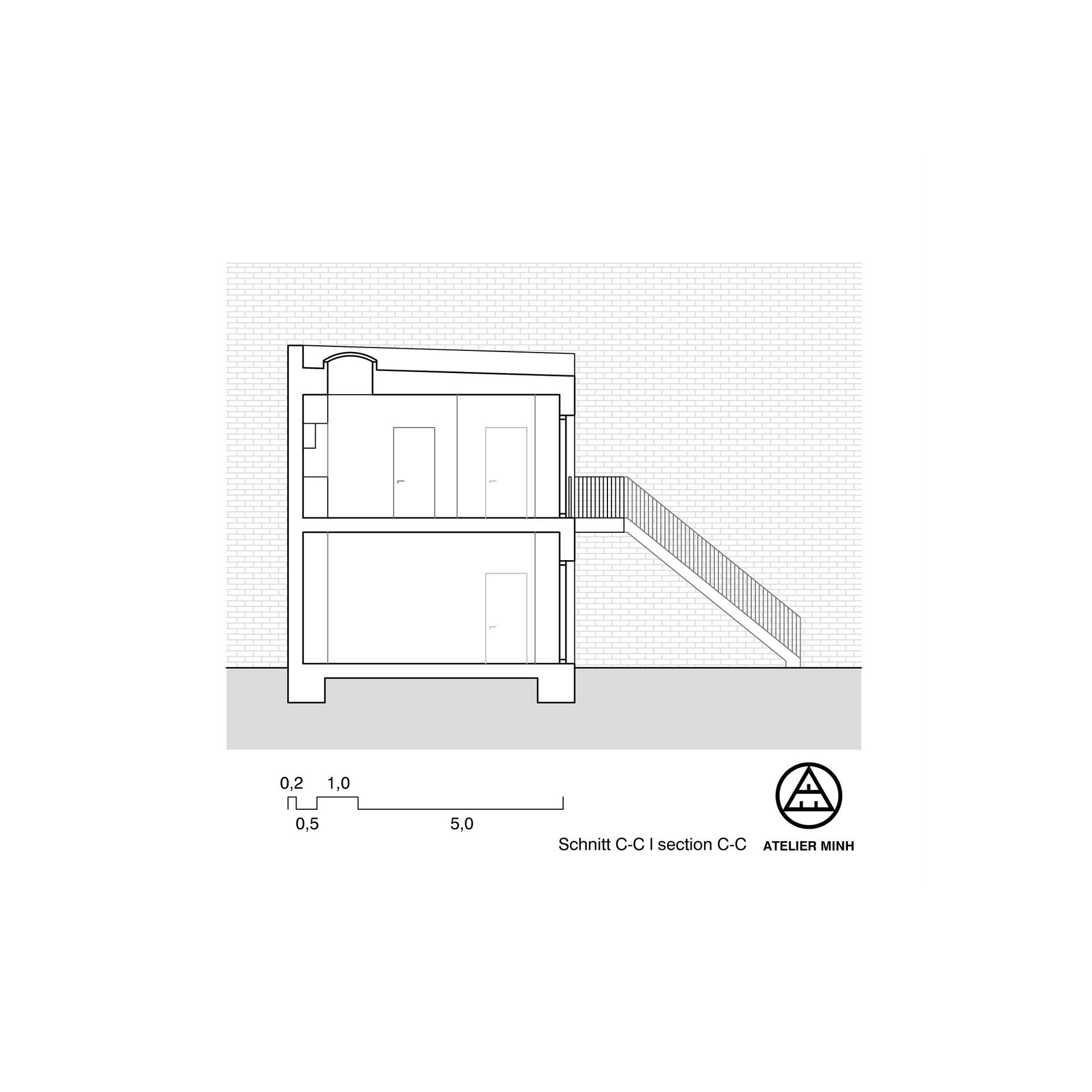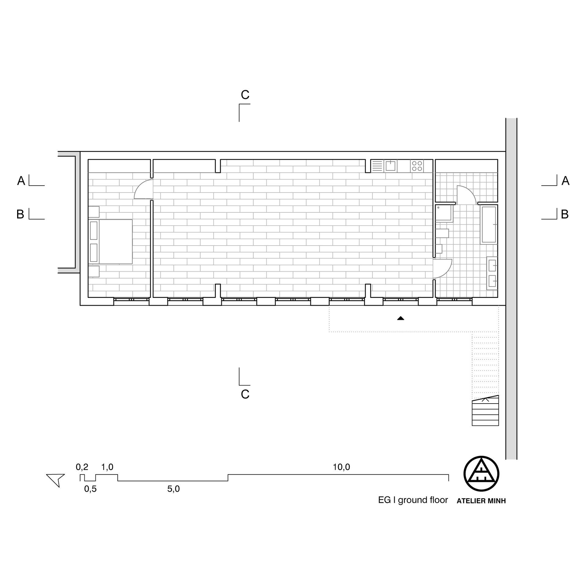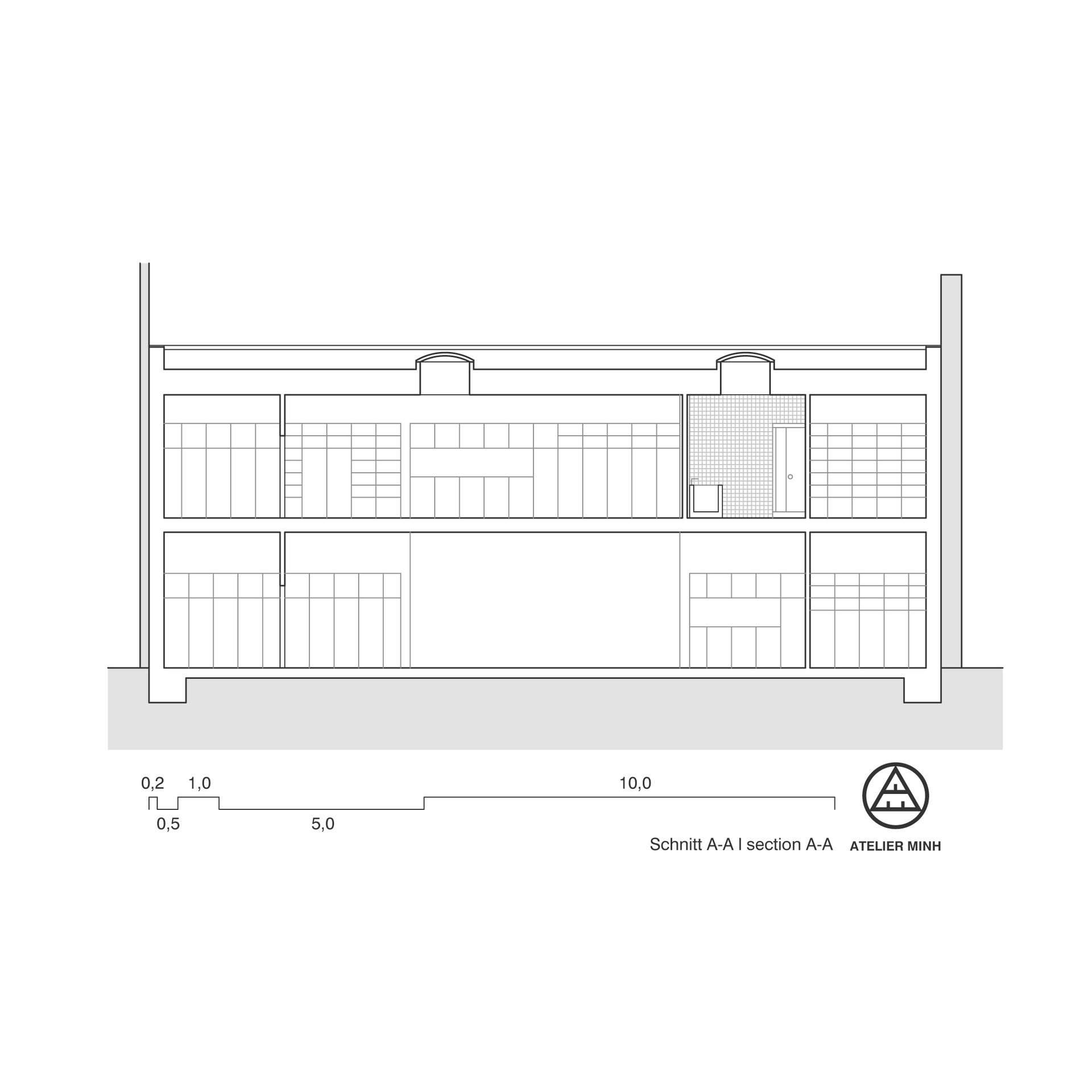 Das ursprüngliche Konzept des Erdgeschosses beruht auf einem großzügigen zentralen Raum, der als Atelier- und Ausstellungsfläche genutzt werden kann. Er ist mit hohen Decken ausgestattet und erstreckt sich über fünf Fensterraster, die sich im Sommer voll öffnen lassen. Der Innenraum wird somit um den Hofbereich erweitert und es steht deutlich mehr Fläche zur Verfügung.