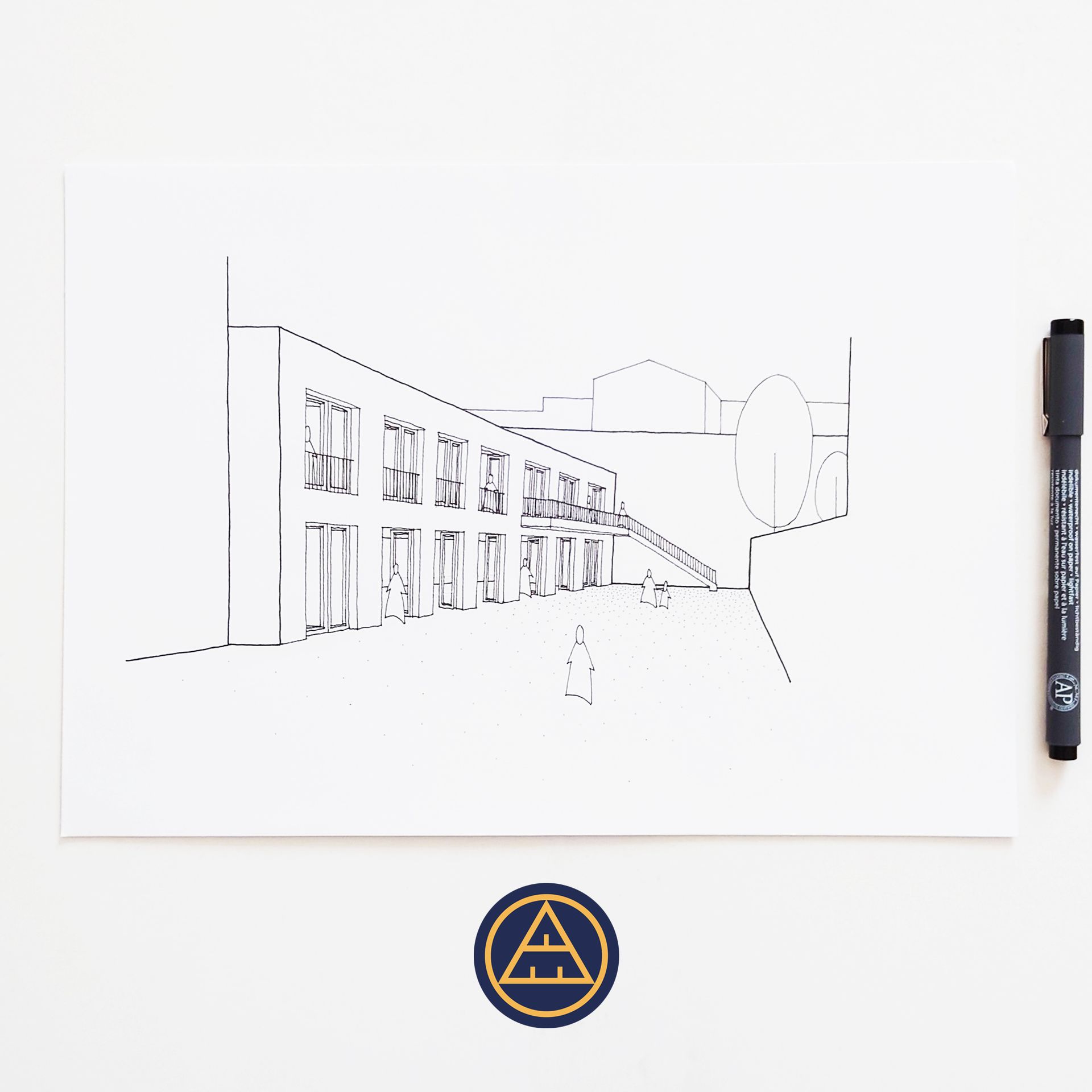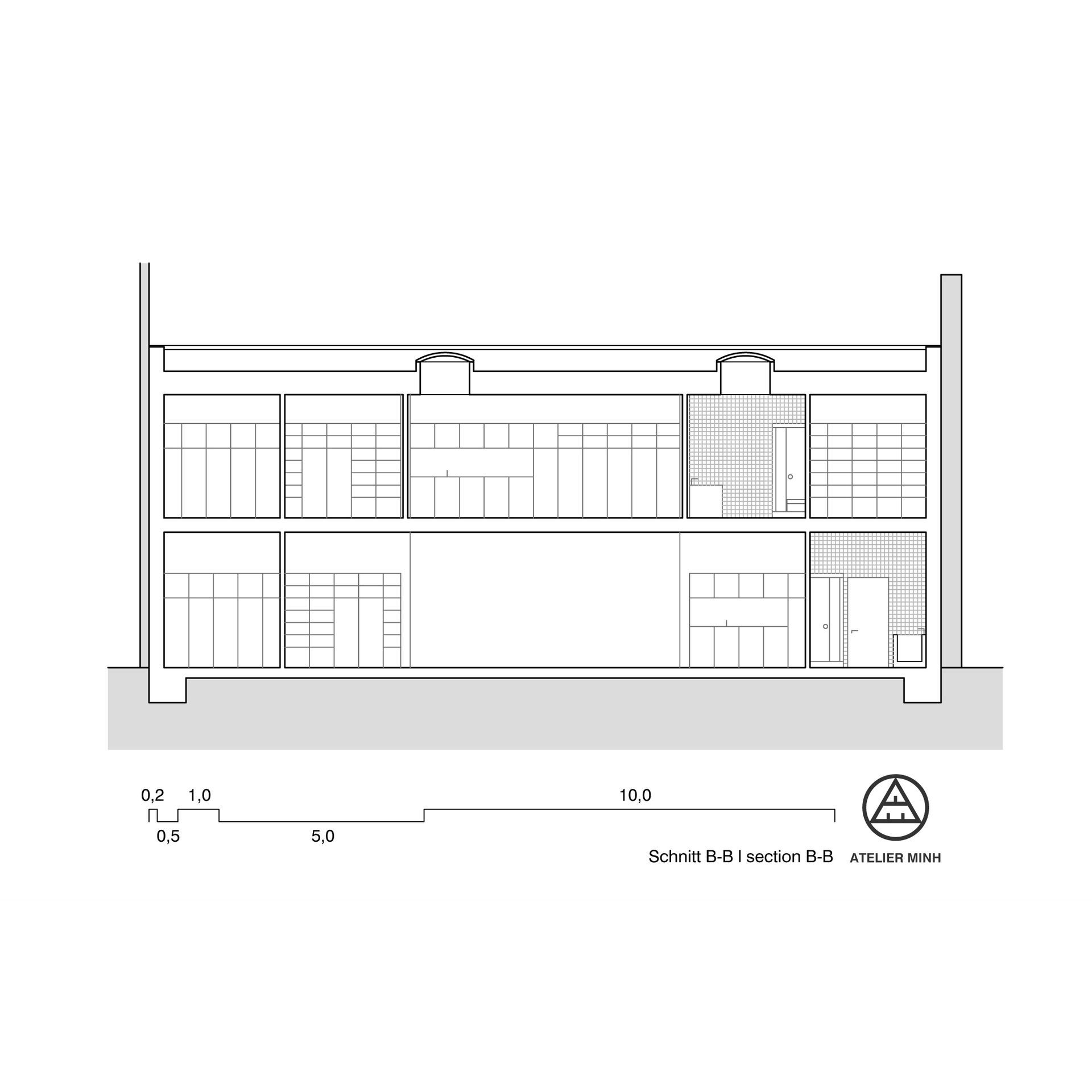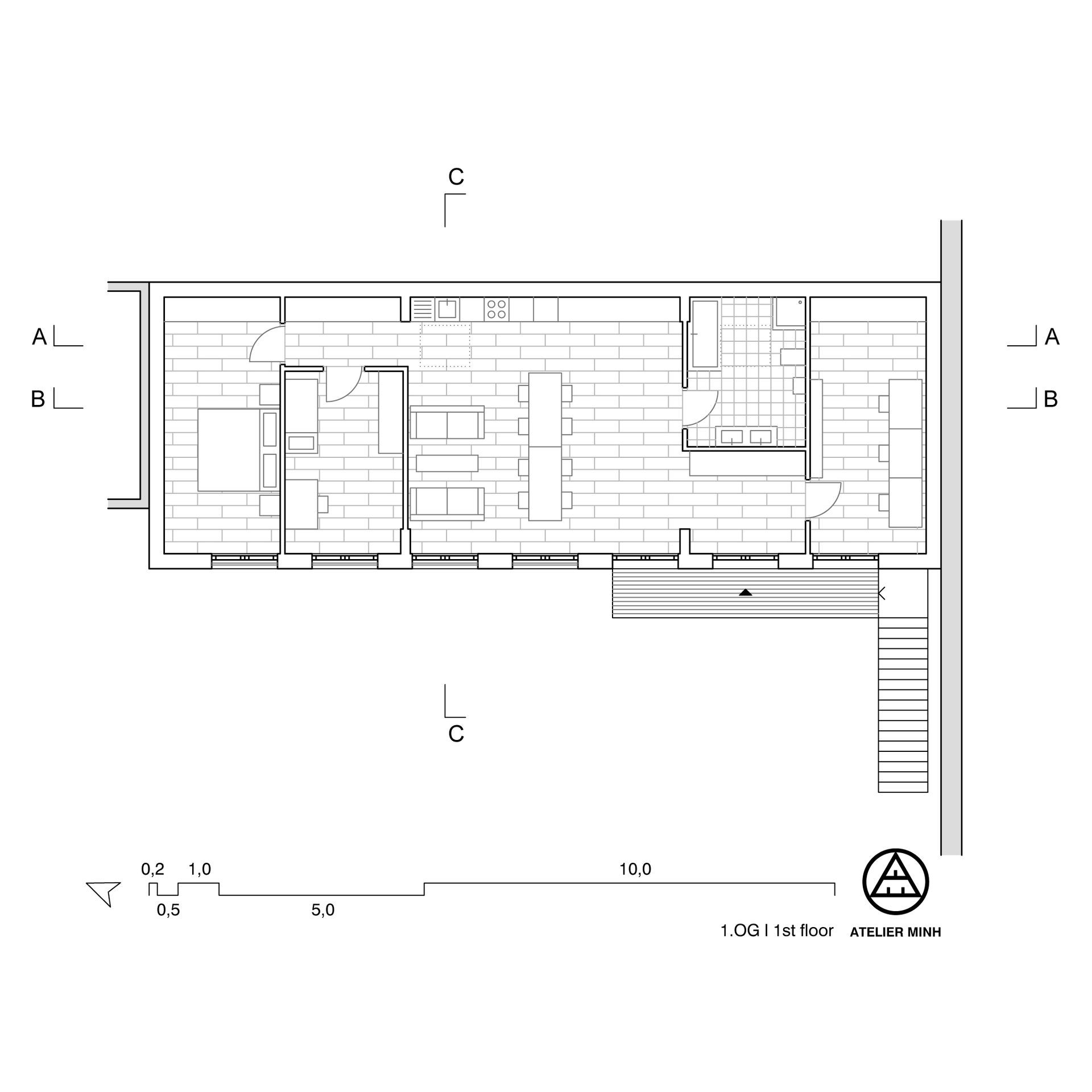 Das ursprüngliche Konzept des Erdgeschosses beruht auf einem großzügigen zentralen Raum, der als Atelier- und Ausstellungsfläche genutzt werden kann. Er ist mit hohen Decken ausgestattet und erstreckt sich über fünf Fensterraster, die sich im Sommer voll öffnen lassen. Der Innenraum wird somit um den Hofbereich erweitert und es steht deutlich mehr Fläche zur Verfügung.