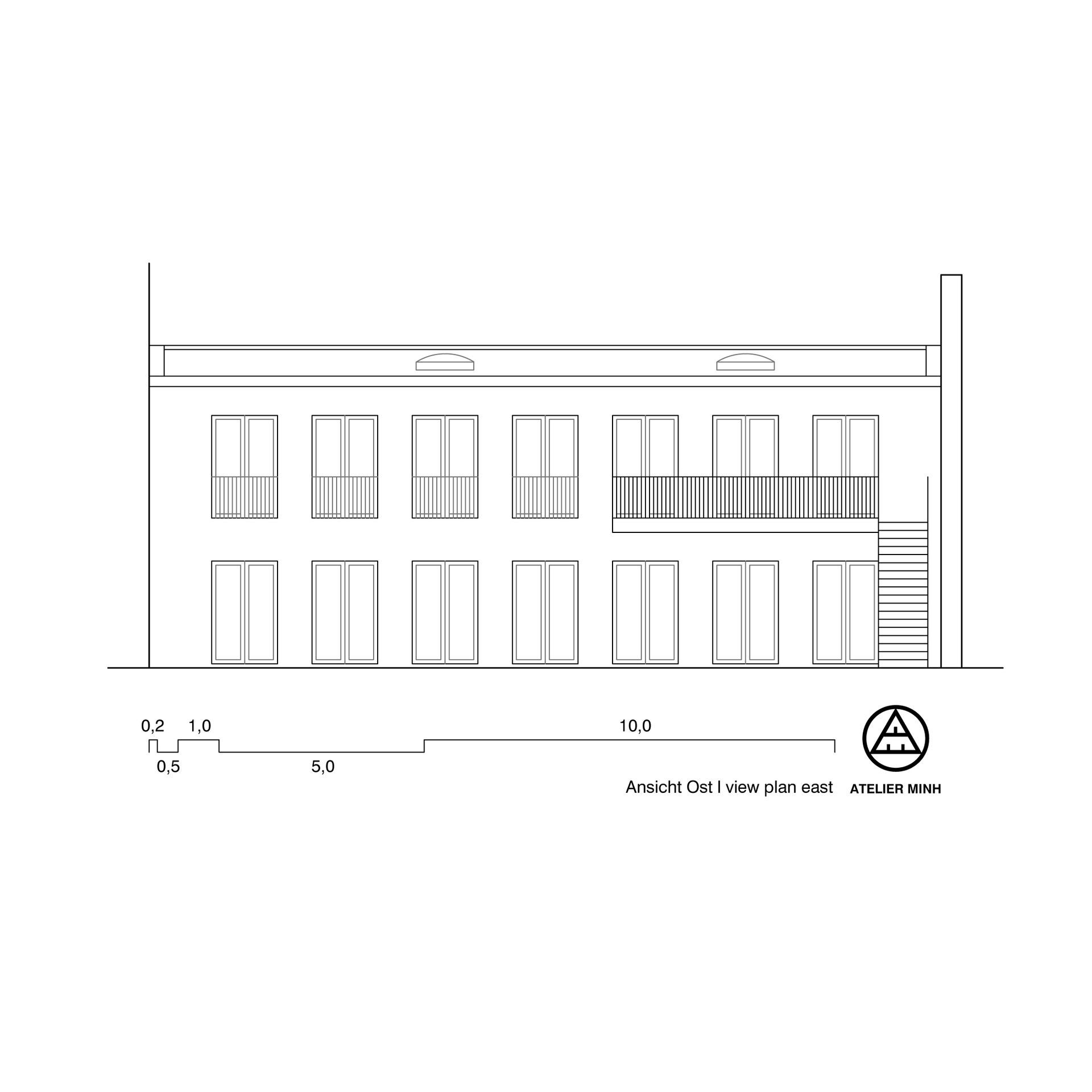 The original concept of the ground floor is based on a spacious central room that can be used as a studio and exhibition space. It is equipped with high ceilings and extends over five window grids that can be fully opened in summer. The interior is thus expanded to include the courtyard area and significantly more space is available.