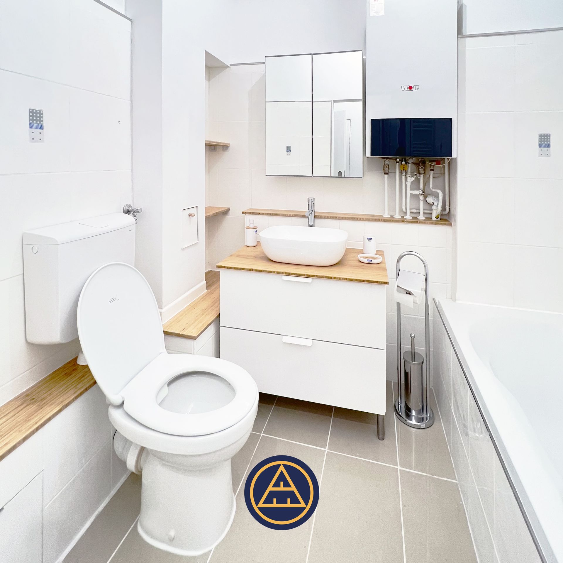 Hierbei handelt es sich um die Modernisierung einer Altbauwohnung in Berlin. Umfassende Maßnahmen betrafen das Badezimmer, Böden, Wände, Anschlüsse und Ausstattung. Das Farbkonzept ist hell gehalten und auf Weiß und Eiche reduziert, um ein großzügiges Raumgefühl zu schaffen.