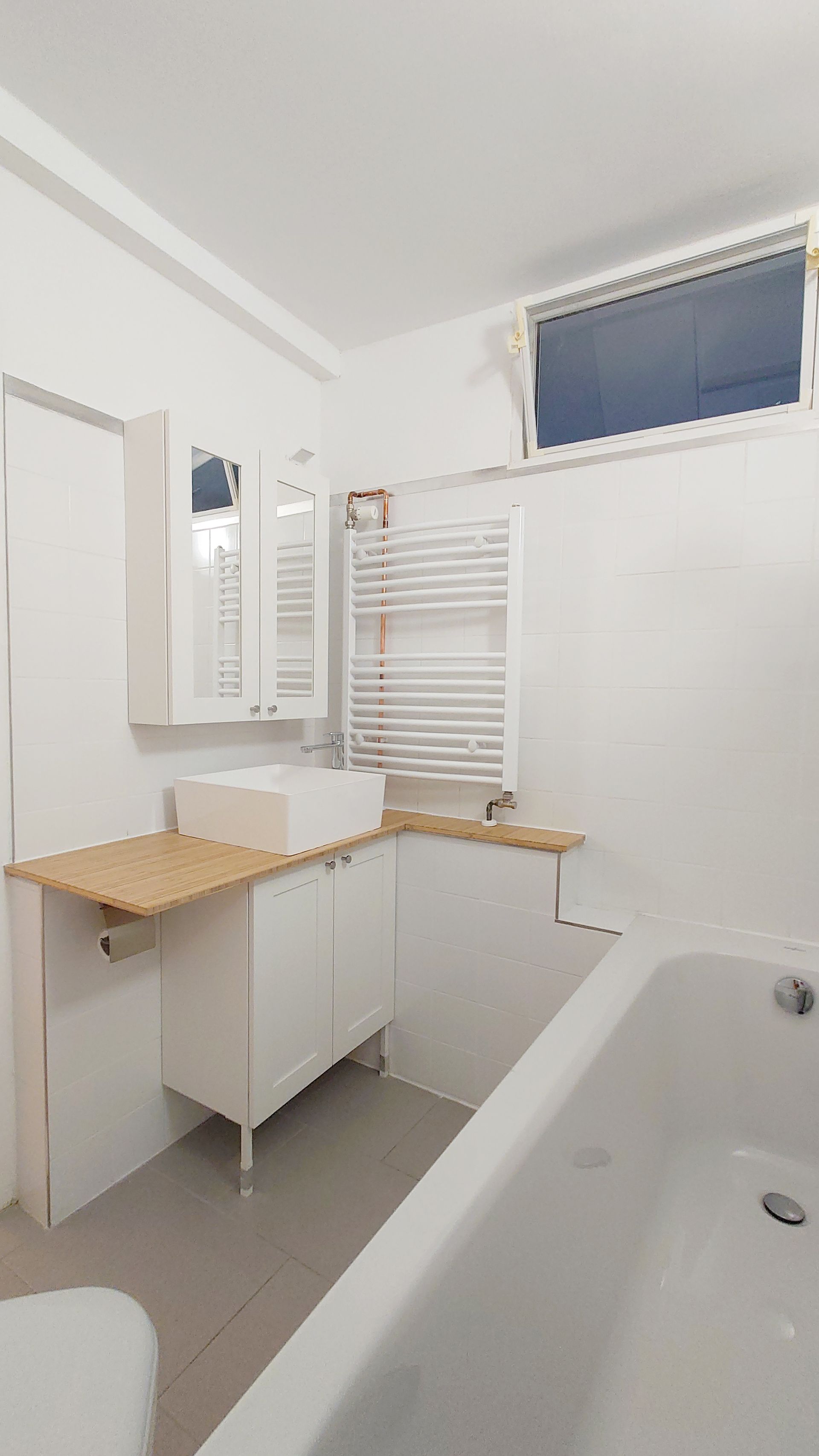 During this renovation of an old apartment in Berlin, extensive measures were taken to create a contemporary standard of living. For this purpose, new oak floor coverings were laid, white skirting boards were installed, the walls were repaired and painted white to create a reduced, bright feeling of space. Another core part of the project is the optimization of the existing bathroom, which was completely renovated and freshly equipped. New white tiles, stainless steel profiles, fittings, furniture and bamboo surfaces are combined to create a clean, hygienic appearance.