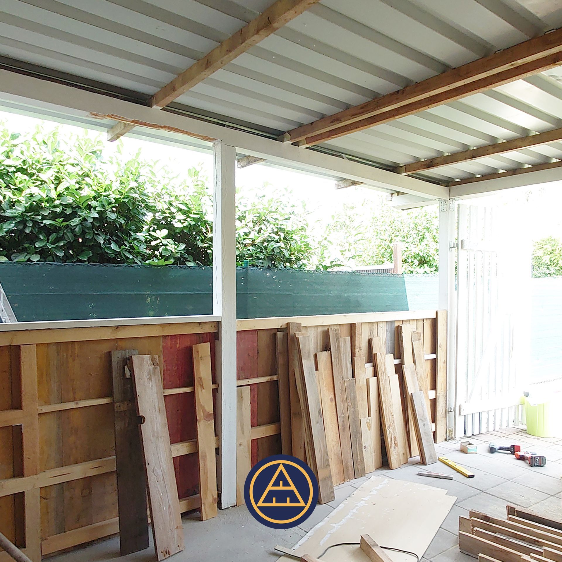 Ein wichtiger Gedanke bei diesem Vorhaben ist der umweltschonende und kostengünstige Einsatz von bereits existierendem Material. Hierzu wird auf Holz zurückgegriffen, welches aus ausrangierten Logistikpaletten gewonnen wird. Aus dem ursprünglichen Produkt herausgetrennt, überzeugen die Holzbretter durch ihre hohe Widerstandsfähigkeit und werden sowohl für Konstruktion als auch Fassade im Entwurf verwendet. Außenseitig verbaut, werden sie durch Wetterschutzlack gegen Umwelteinflüsse gerüstet. Innenseitig montiert, dienen sie als Wandverkleidung und schaffen im neuen Verandabereich eine warme, natürliche Atmosphäre. Am Boden verlegt, fungieren sie als Terrassendielen und verstärken somit den angenehmen Eindruck, sich in einem schützenden Holzraum zu befinden.