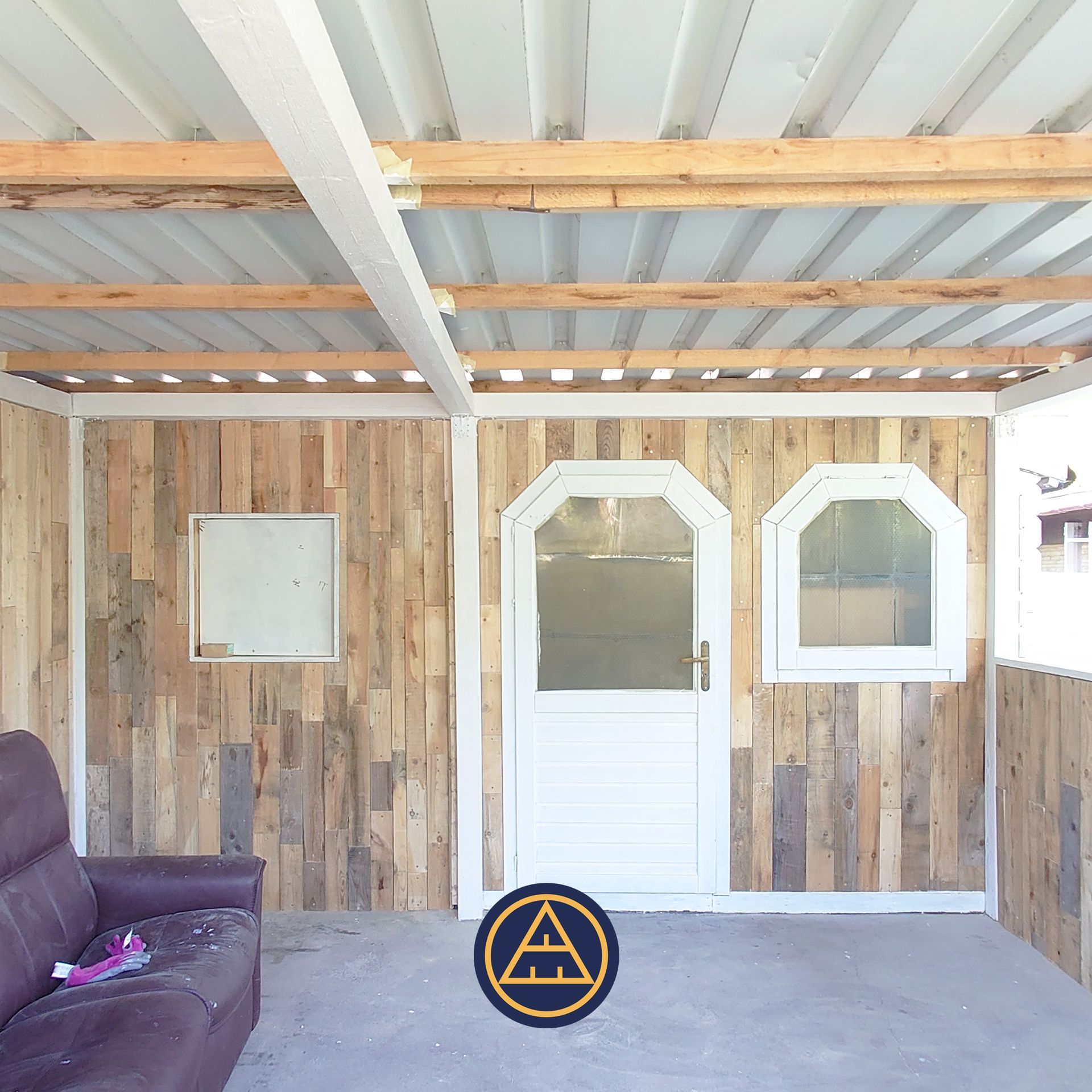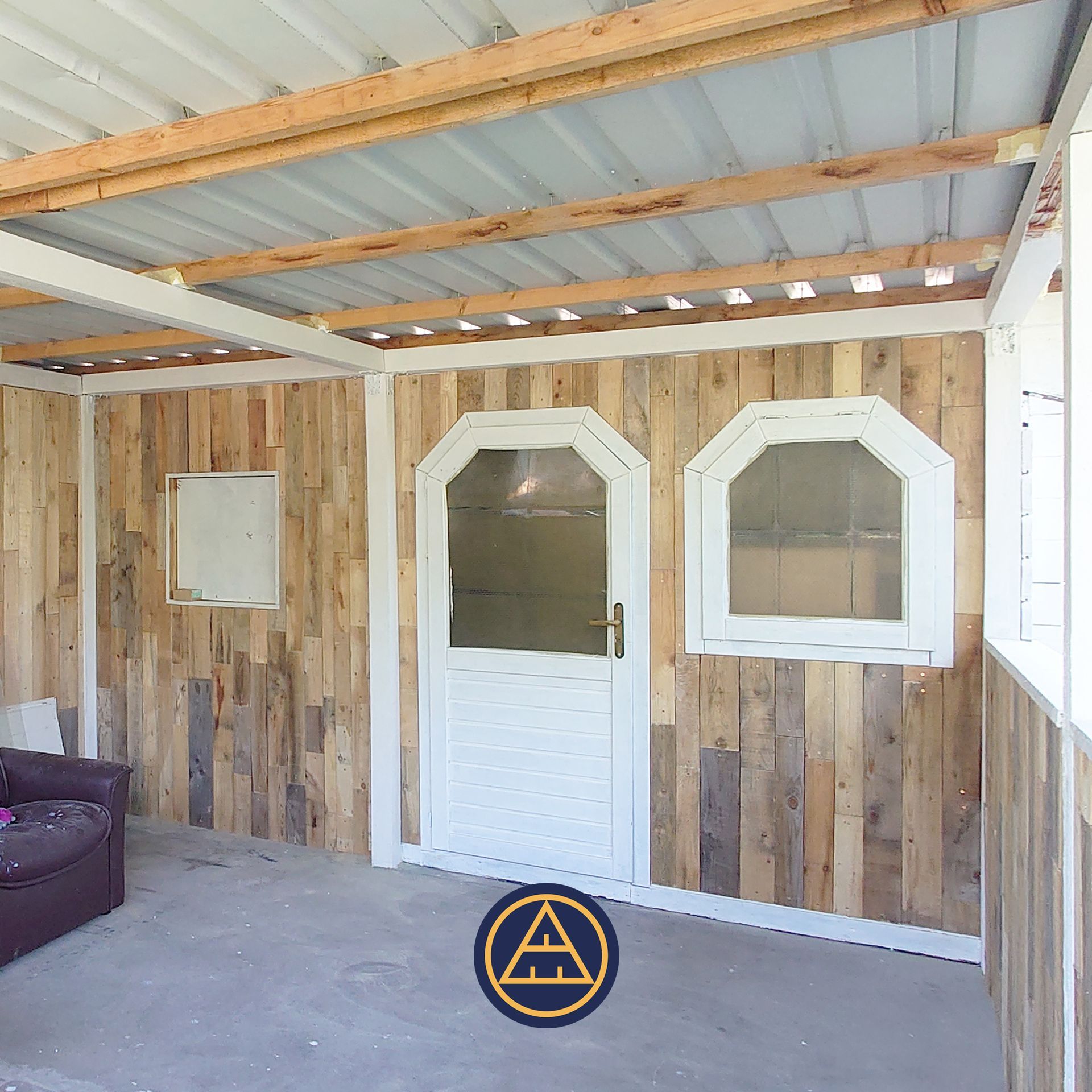 An important idea in this project is the environmentally friendly and cost-effective use of existing materials. For this purpose, wood is used, which is obtained from discarded logistics pallets. Separated from the original product, the wooden boards impress with their high durability and are used for both the construction and the facade in the design. Installed on the outside, they are protected against environmental influences with weather protection paint. Mounted on the inside, they serve as wall cladding and create a warm, natural atmosphere in the new veranda area. When laid on the floor, they act as decking boards and thus reinforce the pleasant impression of being inside a protective wooden space.