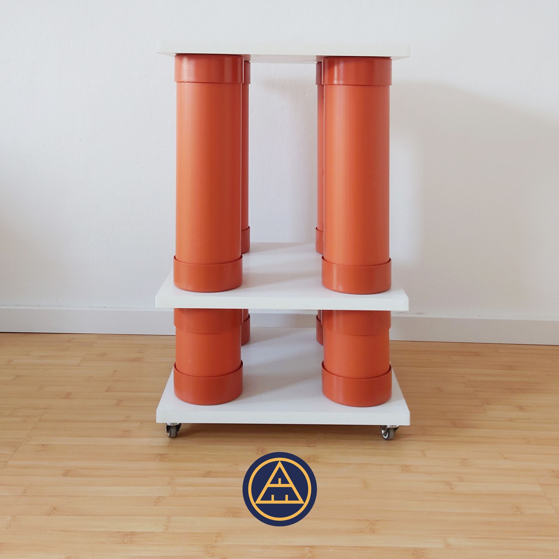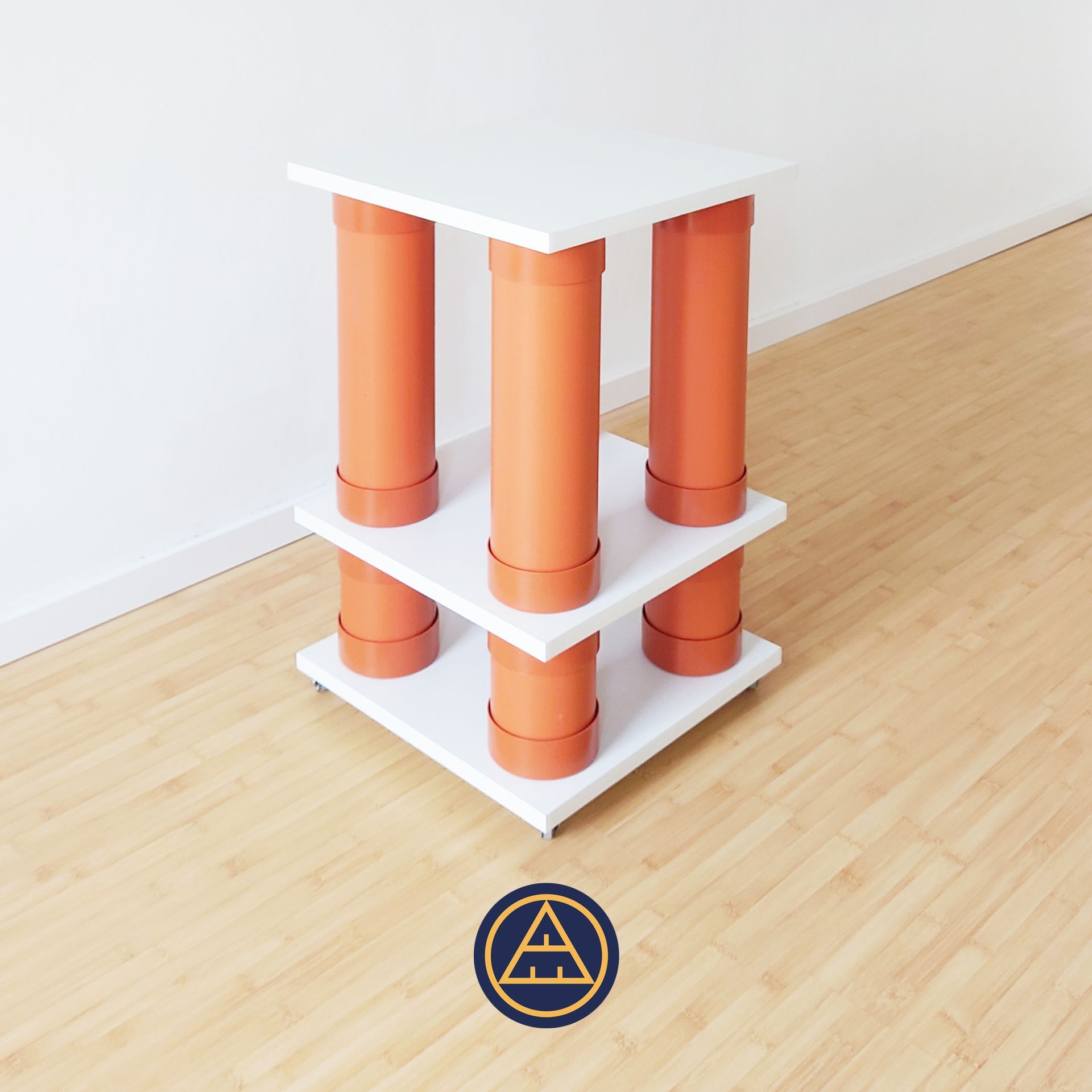 Bei diesem Prototypen handelt es sich um einen Beistelltisch, der durch das Experimentieren mit verfügbaren Entwässerungs-Produkten entstand. Die Möbelbeine sind aus Kunststoff gefertigt und jeweils durch zwei Kappen gedeckelt. Durch diese Anordnung entstehen nutzbare Stauräume im Inneren der Möbelbeine. Weiße Tischplatten fungieren als nutzbare Oberflächen. Insgesamt entsteht eine zweigeschossige Silhuoette, die stark an einen abstrakten antiken Tempel erinnert.
